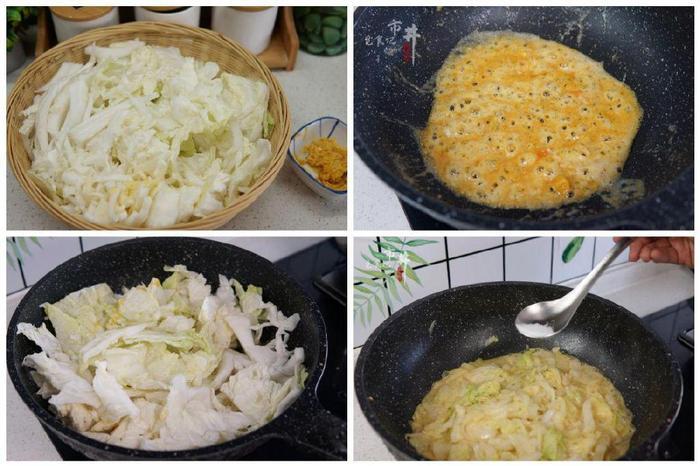 3、这时鸭蛋黄中的油脂已经析出来了,倒入切好的白菜,翻炒至白菜缩水变软,倒入少半勺白醋去腥,中小火翻炒白菜,至白菜析出很多水分。