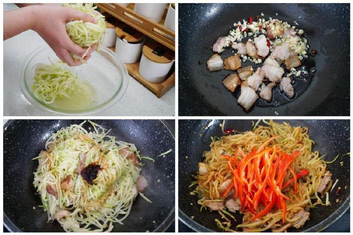 4、萝卜丝上色后加入切好的红椒丝,加入切好的蒜苗和小葱碎,翻炒均匀就可以了。