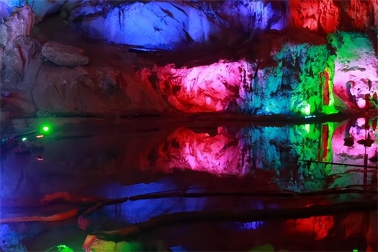 溶洞与地下河 如下图所示,溶洞里的钟乳石、石笋与石柱: