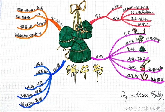 比如这张导图,因为孩子要做端午节主题的手抄报。中心图我画了粽子,看到粽子大家第一个联系就是端午节