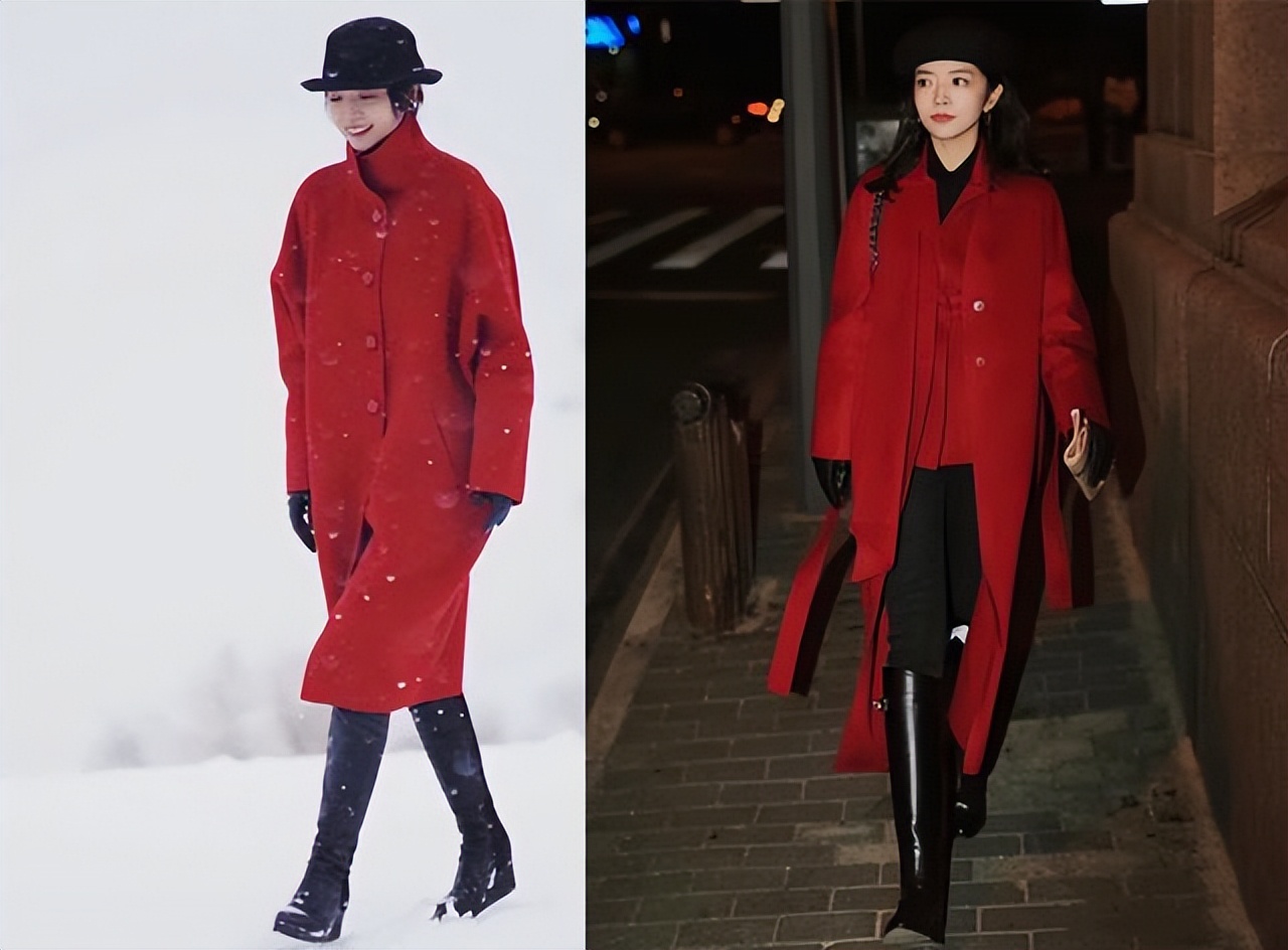 红色想要穿得好看,质感一定要好,用垂坠高级的大衣承载,刚好为明艳的红色增加点优雅沉稳。为了避免红得太亮眼,用高级黑压制中和非常推荐。三木的选择就是红色长大衣+小黑裤+高靴,虽然仅有两种颜色,但叠搭的单品很有层次感,丝毫不显单调。