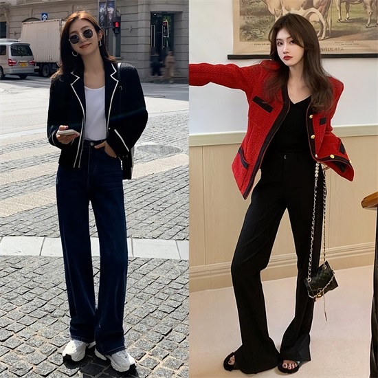 所以在选择牛仔直筒裤这种面料的时候一定要注意面料的柔顺度,越柔顺的面料在搭配小香风外套的时候能给我们带来越好的穿搭效果。