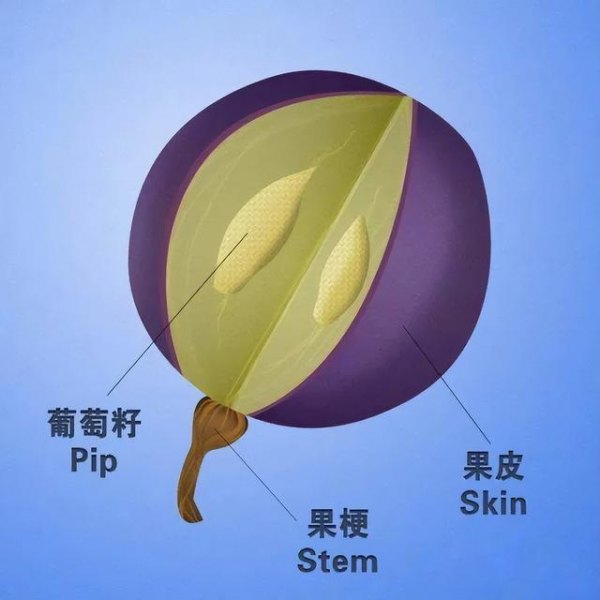 前面我们已经提到,葡萄皮的单宁含量最为丰富,而不同品种的葡萄,葡萄皮的厚薄和颜色均不同。常见的酿酒葡萄品种中,赤霞珠、内比奥罗、西拉、丹魄等属于高单宁品种;歌海娜、梅洛、巴贝拉、黑皮诺、佳美、巴贝拉等属于低单宁品种。