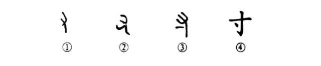 “相思不可寄,直在寸心中。”这个“寸心”的“寸”字,比喻区区之心。其实“寸”字在甲骨文和金文中作偏旁用时,与“又”(手)字并没有什么区别。你看甲骨文①和金文②的形体就是“手”(又)形。③是小篆的形体,在手下之左侧有一小横,这是离手掌一寸的地方,就叫“寸口”(试脉处)。④是楷书的形体。