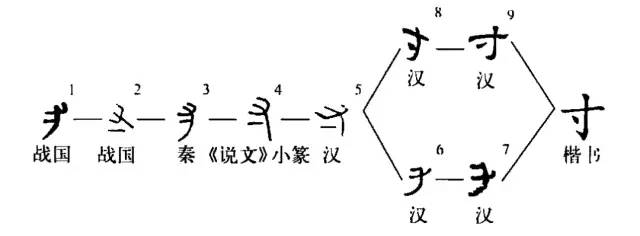 指事字。从又,从一。又为手之象,一是指事符号,处在手下一寸之地的寸口处,指出此地是寸口所在,上距后腕一寸。战国文字已见寸字,结构与《说文》相同。隶变时,其结构、笔形、笔序、笔划均经过多次调整。或将指事符号上提,两笔成