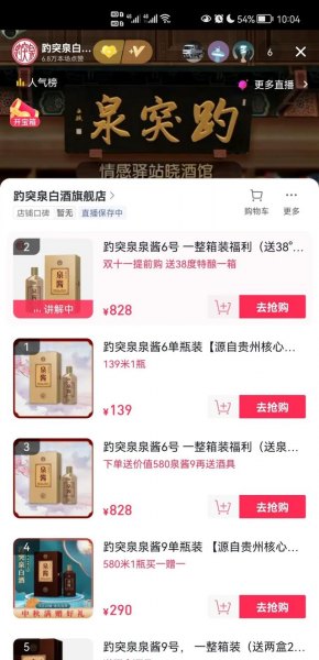 据主播介绍,泉酱为趵突泉近两年推出的新品酱香型白酒,产自茅台镇趵突泉新建酒厂,和茅台采取相同坤沙工艺,线下零售价为280元/瓶,而在抖音直播间仅售139元,几乎相当于市场价的一半。
