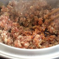 7. 再放入肉泥,加入花椒面,盐调味