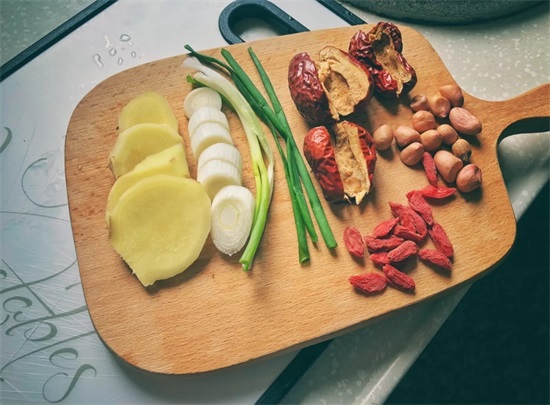 食材以及调味料的准备:老姜,大葱(白段),小葱,红枣(去核,下火的),花生,枸杞。