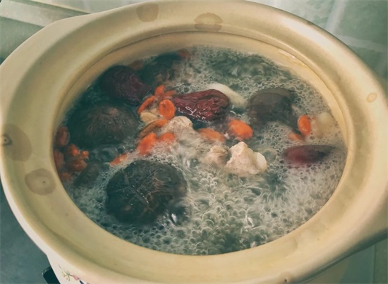 4、将红枣,花生,枸杞,花菇,莲藕,放入砂锅,把焯水过的筒骨一同放入,一次加满水,煲汤不能半途中加水噢,一次加够。
