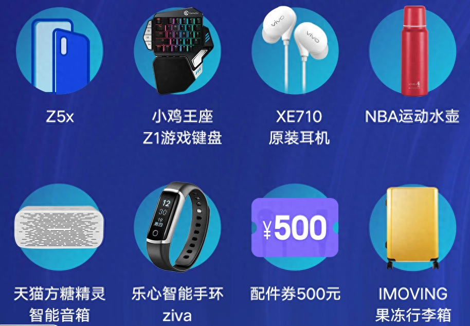 获奖用户的奖品很多,包括vivo Z5x、小鸡王座Z1游戏键盘,NBA运动水壶、天猫方糖精灵智能音箱、乐心智能手环ziva、500元的配件券、还有IMOVING果冻行李箱,可以说非常的让人心动了。
