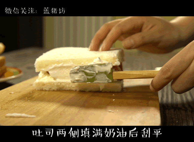 4,盖上吐司,将吐司两侧奶油刮平,放入冰箱后冷藏定型即可食用
