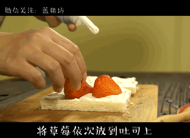 3,将草莓依次放到吐司上,在缝隙处用奶油填满后再用刮刀刮平