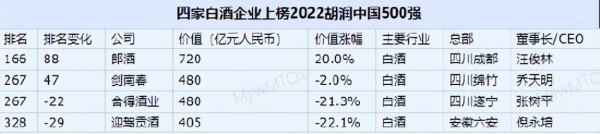 日前,胡润研究院发布了《2022胡润中国500强》,郎酒、剑南春、舍得酒业、迎驾贡酒等四家白酒企业上榜。郎酒以720亿元价值排名166位,剑南春、舍得酒业均以480亿元价值排名267位、迎驾贡酒以405亿元价值排名328位。