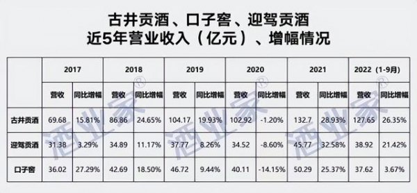 而根据2022年前三季度迎驾贡酒和口子窖的营收对比,迎驾贡酒前三季度营收38.92亿,口子窖营收37.62亿,口子窖少于1.3亿暂时落后于迎驾贡酒。今年,迎驾贡酒有望夺回“老二”地位。