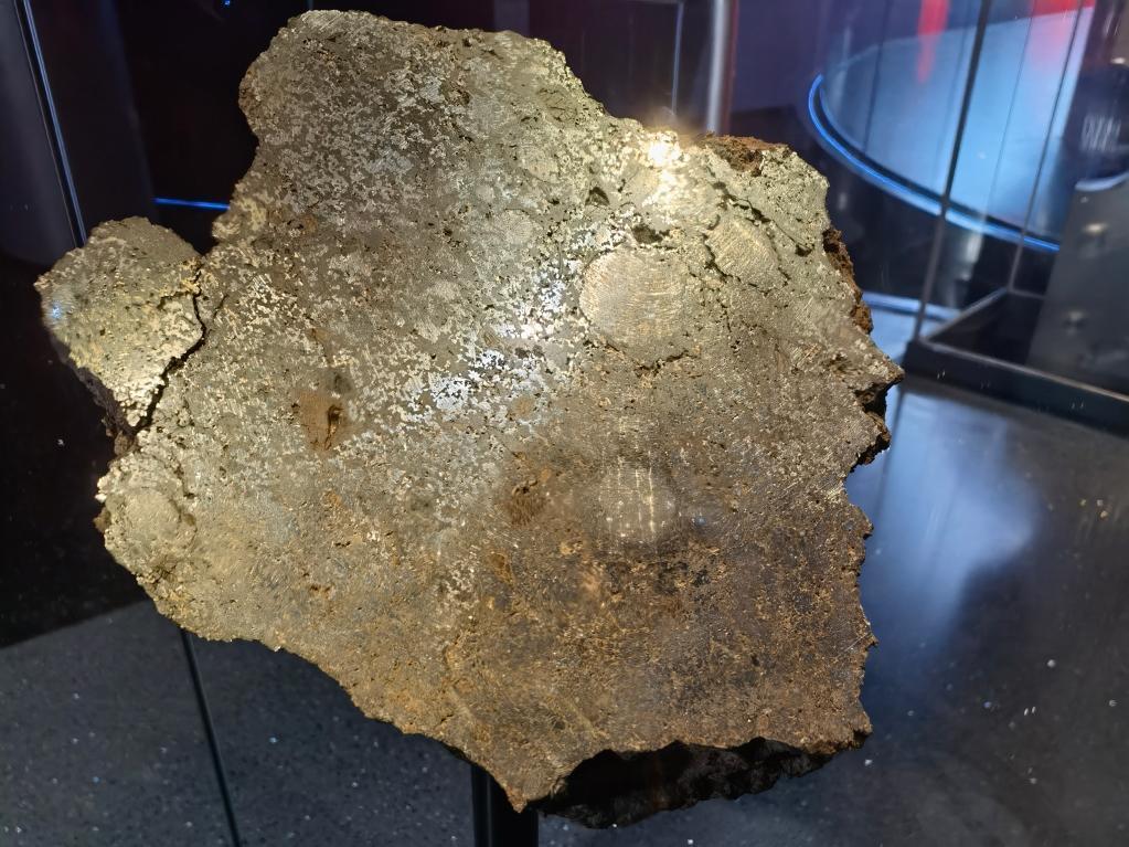馆内展出的东乌珠穆沁旗陨石于1995年9月在内蒙古东乌珠穆沁旗地区上空陨落。这是一块稀有的石铁陨石子类中铁陨石,切面可见漂亮的大颗粒金属结核状结构,局部可见角砾状橄榄石晶体。