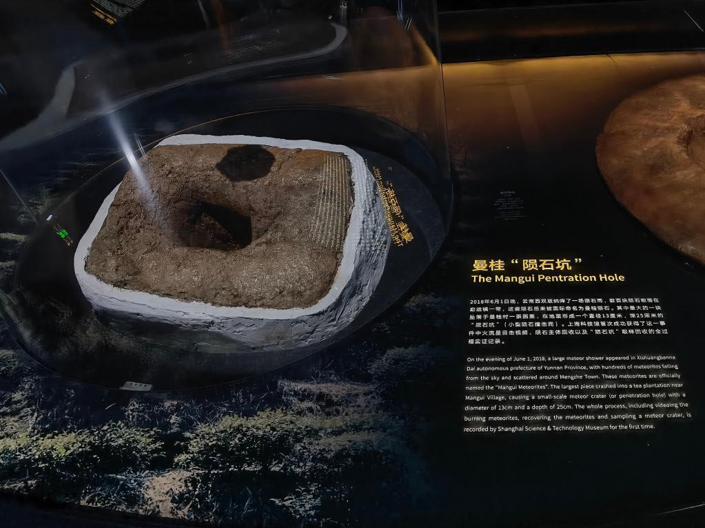 上海天文馆收藏的曼桂“陨石坑”,记录下陨石到来的瞬间。2018年,云南发生了一场陨石雨,数百块陨石散落在勐遮镇一带,其中最大的一块坠落在当地曼桂村一个茶园里,在地面形成直径13厘米、深25厘米的小型陨石撞击洞。林清介绍,绝大多数陨石坑形成后容易被破坏,或者坑洞过大不适用于收藏和展示,这件曼桂“陨石坑”保存完好、大小适中,十分难得。