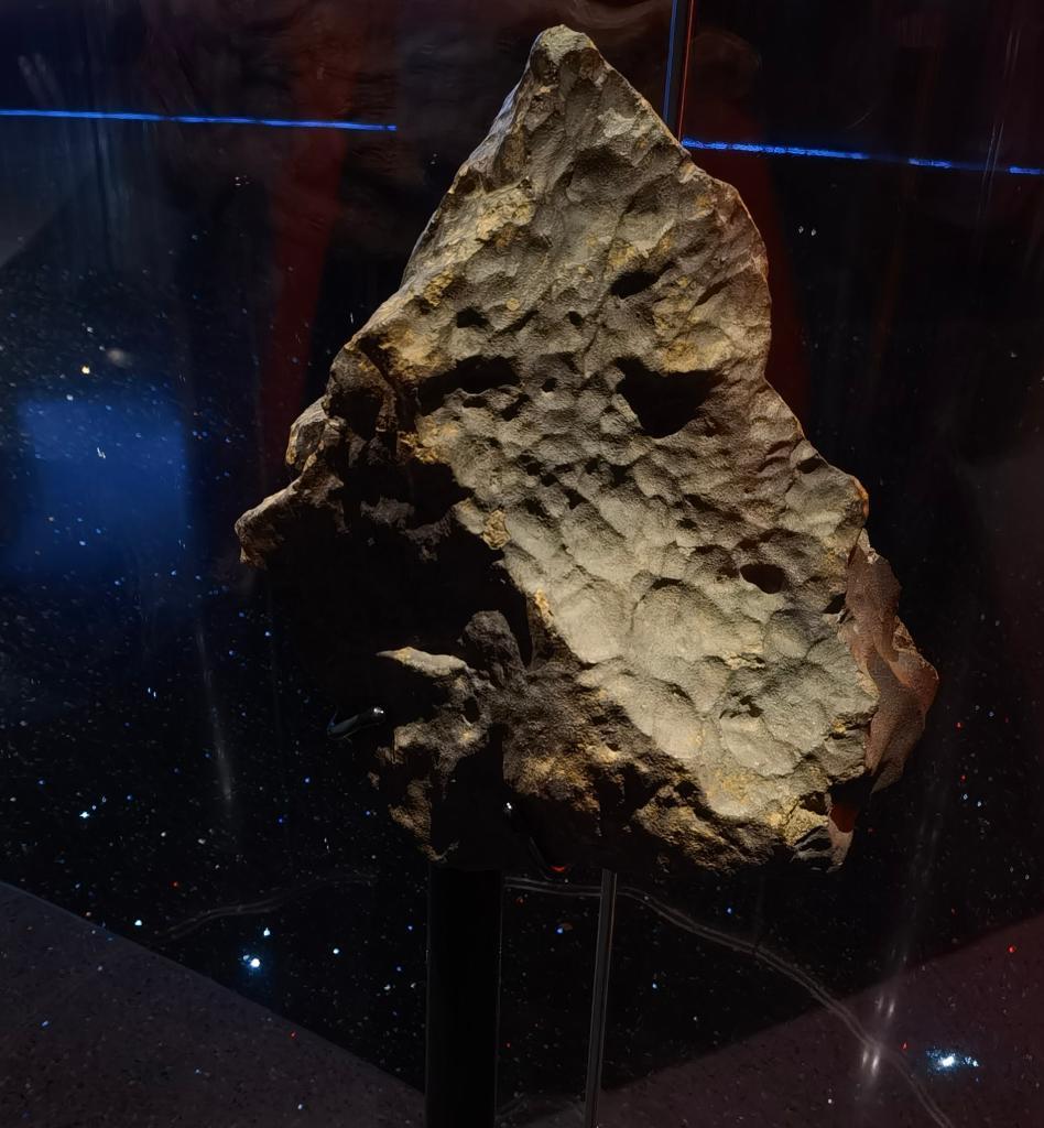 陨石的到来可能十分“轰动”。上海天文馆内有一件第六站陨石,别看它只有71克,其貌不扬,但它是人类第一次,也是迄今唯一一次跟踪小行星坠落地球并找回的陨石标本之一——2008年,小行星2008TC3在苏丹努比亚沙漠上空发生空爆,形成陨石散落区,最终人们在该地区收集的标本总计3.95千克,第六站陨石是其中之一。