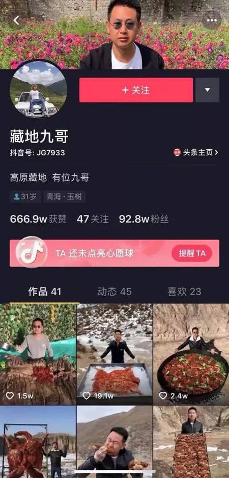 他猛然惊醒:短视频传播面广,要抓住这个商机,用它推广产品,增加收入从那之后,藏地九哥开始研究快手等平台,研究如何拍作品,如何上热门,从吃鸡到烤全羊,再到烤两头牛,甚至烤骆驼,他自称西北户外美食第一人,拍摄作品四百多个。