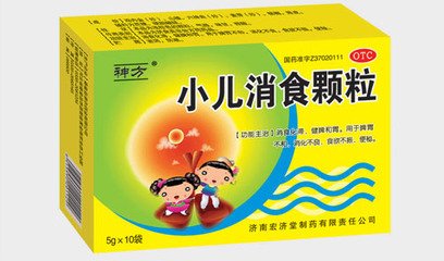 8、小儿消食颗粒:由鸡内金(炒)、山楂、六神曲(炒)、麦芽(炒)、槟榔、陈皮组成。消食化滞,健脾和胃。用于脾胃不和,消化不良,食欲不振,便秘,食滞,疳积。