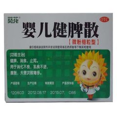 12、婴儿健脾散:由白扁豆(炒)、山药、鸡内金(炒)、白术(炒)、川贝母、木香(炒)、碳酸氢钠、人工牛黄组成。健脾、消食、止泻。用于消化不良,乳食不进,腹胀,大便次数增多。