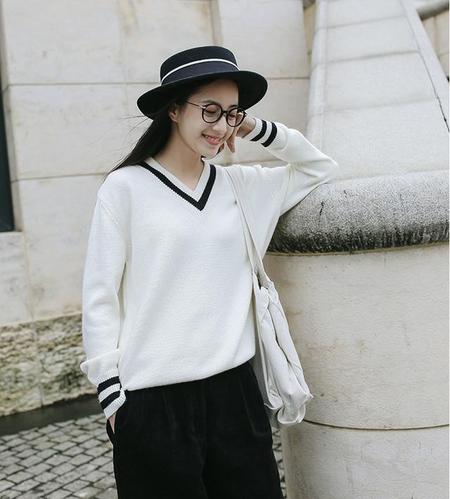 学院风的V领毛衣从男装一直流行到了女装。领口的撞色很有看点,大V领也能够很好的起到修饰脸型的作用。外搭大衣夹克都不在话下。