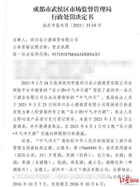 刘飞说,从一品天下公司投诉到今年年初,公司一直积极配合市场监管局工作人员的相关调查问询,同时按要求如实提供各项资料。但就在几天前,也就是2022年3月24日,公司收到了一份由武侯区市场监督管理局下达的《行政处罚决定书》,称其公司销售的“谷小酒·牛气冲天”酒侵犯了一品天下公司的权益,被认定违法。