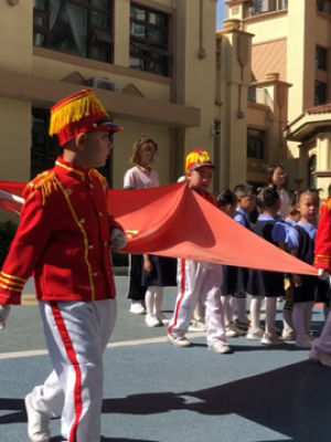 随着激昂的“运动员进行曲”,小小旗手高举国旗,正步到升旗台,将国旗交给升旗老师,继而奏响国歌,全体师幼行注目礼,注视着国旗缓缓升起,心中肃然起敬。