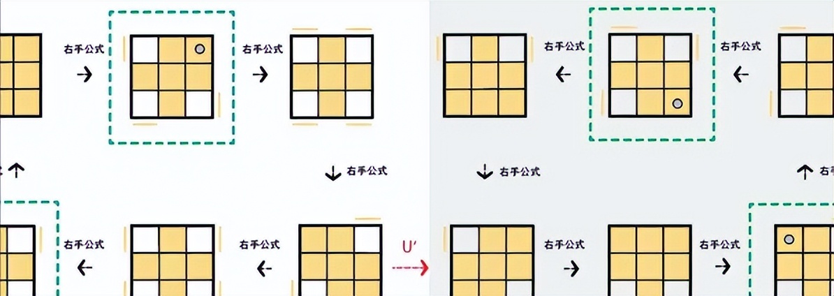 按箭头方向一直拧右手公式会在下图内循环,可以发现在灰色区域内的循环无法靠左手公式还原顶面