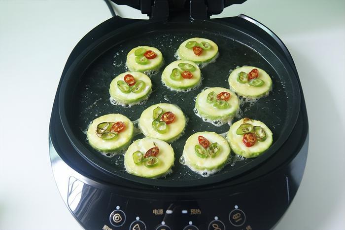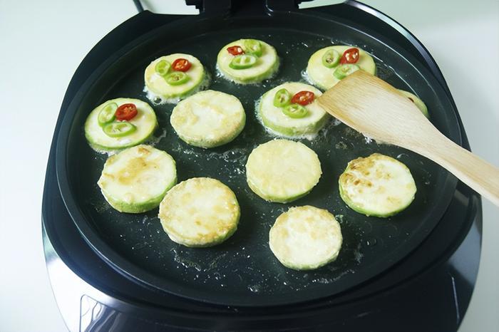将裹好面粉和鸡蛋液的西葫芦饼依次放入煎烤机,让它们在温暖的热力下煎至一面金黄。然后再翻转另一面,待两面都变得金黄香脆时,就可以起锅装盘了。若不确定煎至何种程度合适,可用筷子轻轻戳一下西葫芦的中心,若中心变软且两面金黄,则表示煎饼已经烹制完美。