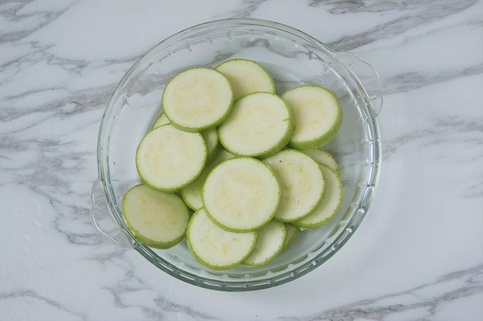 首先,将所有食材备好,准备洁净的西葫芦,切成约5毫米厚的圆片。青红椒则切成漂亮的斜圈,为后续的装饰做准备。