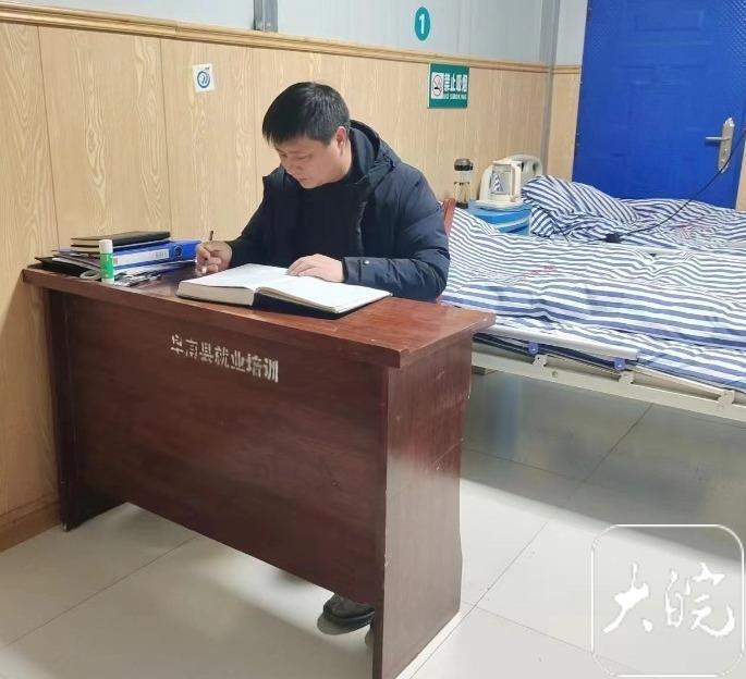 夜晚,杨建在中岗镇卫生院的医生宿舍里办公。
