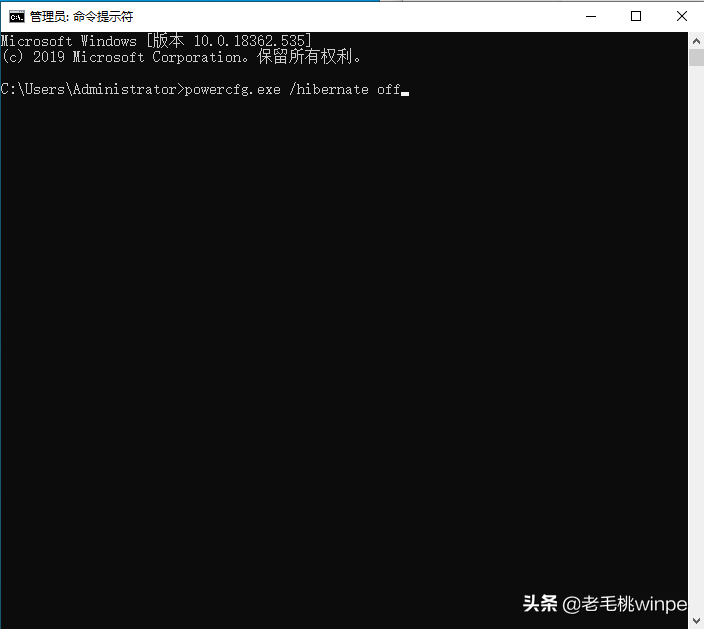 2、 在弹出的管理员命令提示符窗口中输入【powercfg.exe /hibernate off】,回车即可。