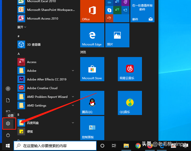 1、 打开开始菜单,点击带有齿轮标识的【设置】图标;