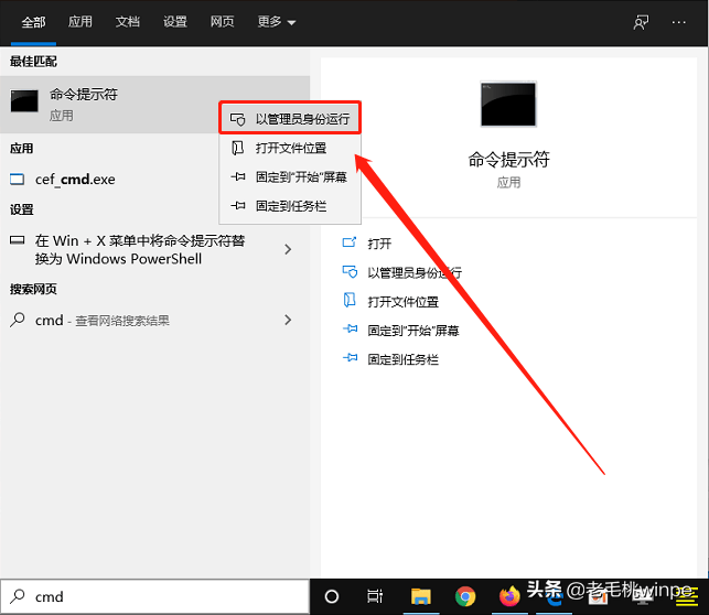 1、 在搜索框中输入【cmd】,右键点击选择【以管理员身份运行】;