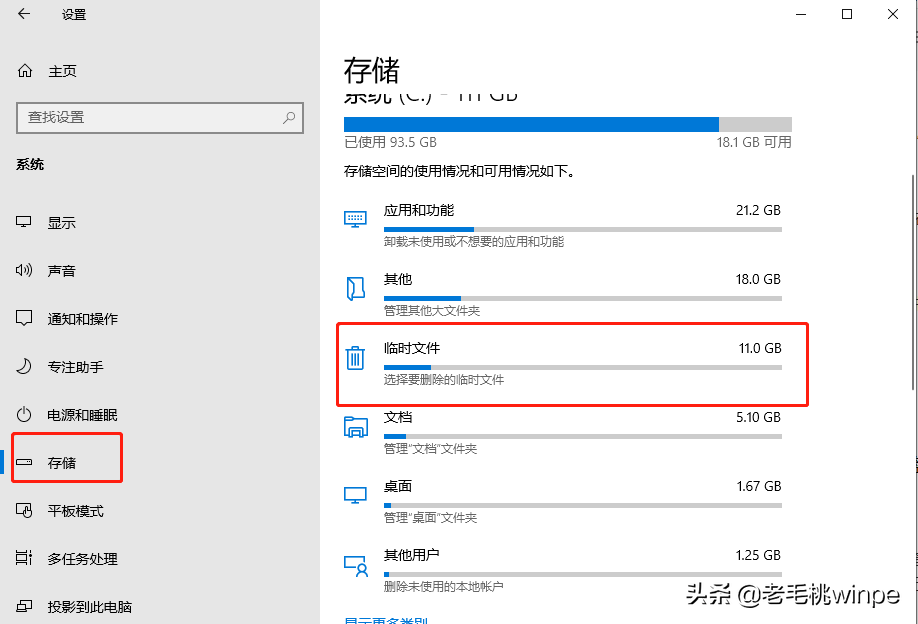 2、 打开设置后,依次点击【系统-存储】,接着在窗口右侧找到并点击【临时文件】;