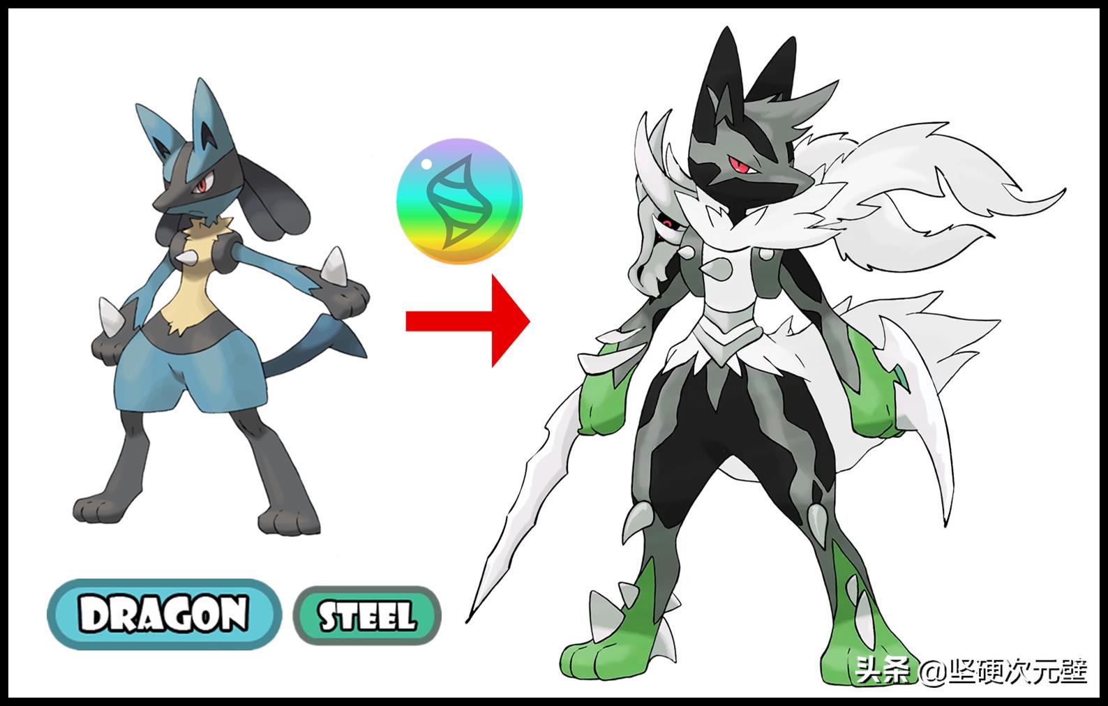 如果路卡利欧也“基因不稳定”的话,在特殊的情况下,利用进化石可以进化成为“龙+钢”属性的mega形态,不过很明显可以看得出来,路卡利欧因为原型是“死神”阿努比斯,所以龙属性的变形形式是“骨龙”,依附在身上,使其攻击、防御都大幅提升!