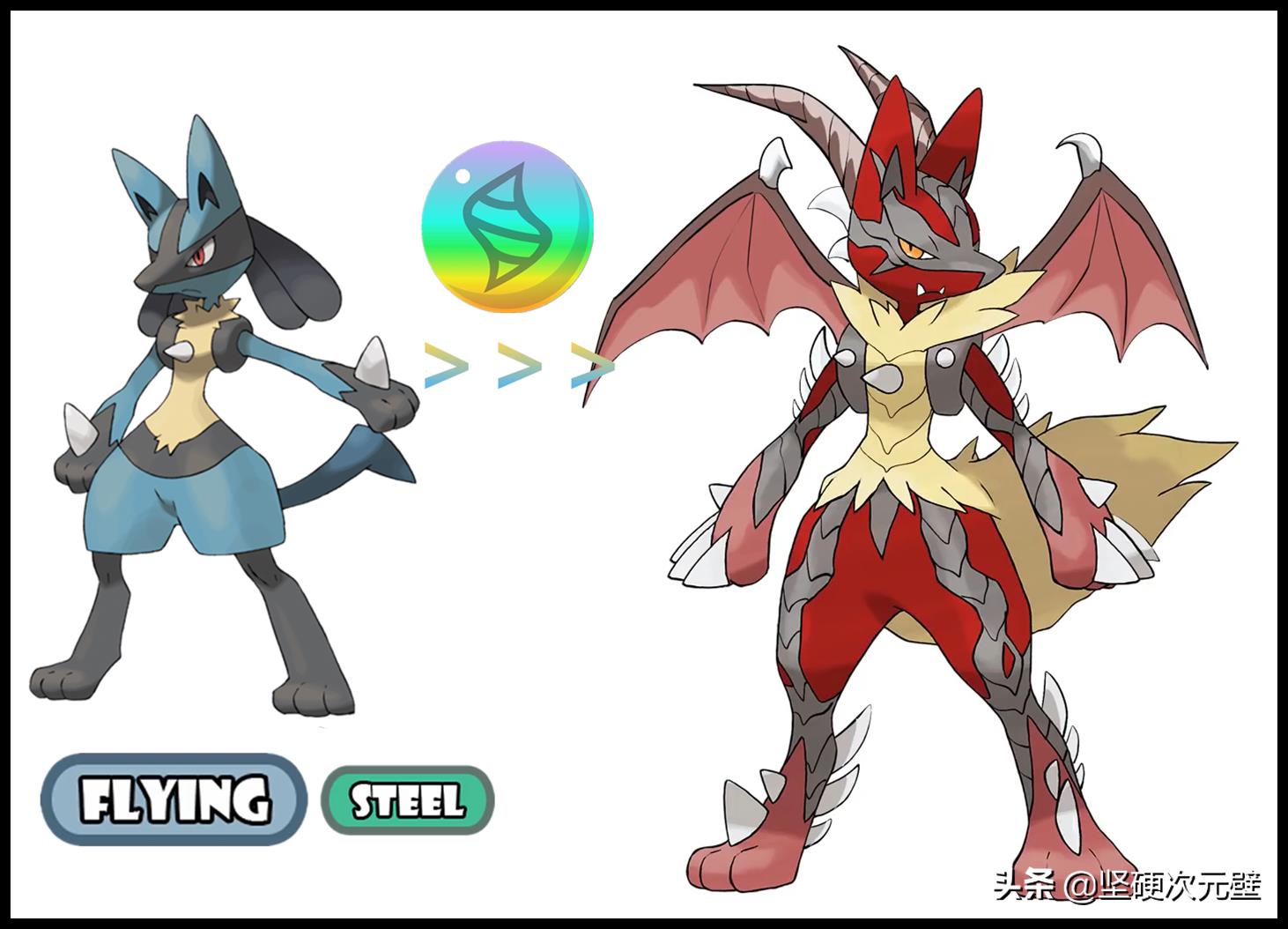 如果路卡利欧也“基因不稳定”的话,在天空中使用进化石,进化成为“飞行+钢”属性的mega形态,背上长出一对恶魔翅膀,头上也长出两只恶魔角,虽然是飞行属性,但是看上去似乎也非常有“恶魔”的感觉!