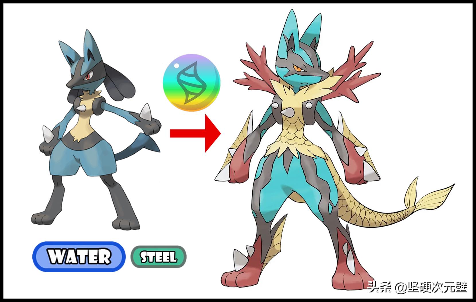 如果路卡利欧也“基因不稳定”的话,在池塘边上使用进化石,可以进化成为“水+钢”属性的mega形态,浑身长出鱼鳞、鱼尾,肩膀上海伸出了类似“龙角”的东西,看上去很酷炫!