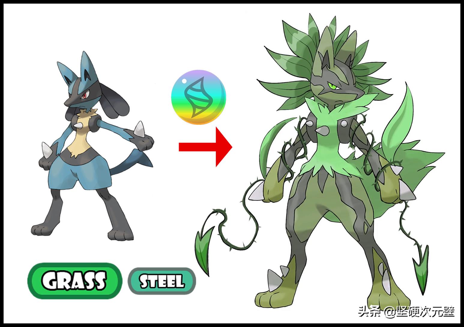 如果路卡利欧也“基因不稳定”的话,在森林中获得进化石,进化成为“草+钢”属性的mega形态,整个都“绿”了,后脑上长着一簇树叶,手上缠绕着两条荆棘藤鞭,看上去战力超强!
