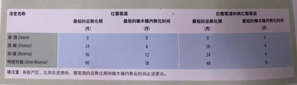 西班牙的葡萄酒法规对红葡萄酒和白葡萄酒规定了具体的熟化标准。达不到这些等级的葡萄酒就只能标注为西班牙葡萄酒(Vino)。