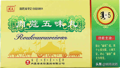 肉蔻五味丸,具有祛心“赫依”病的功效,本方由肉豆蔻、木香、广枣、土木香、荜茇组成。用于心神不安,心烦失眠,对新“赫依”病尤为有效。(注解:如果“赫依”的功能失常,主要可以表现为神志异常、失眠、健忘、麻木、疲乏、眩晕、抽搐、瘫痪等脏腑功能减退等。)