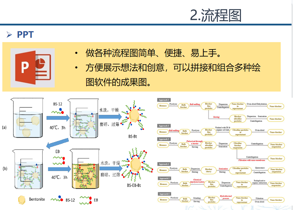 当然,PPT也可以用来绘制相应的流程图,用它的话,就显得花样很多,可以是实验步骤的流程图,也可以是不同研究方法的对比流程图,其可以拼接和组合多种绘图软件成果图的方式,让其来展示的内容也就比较多样,使用的时候就看个人的喜好了。