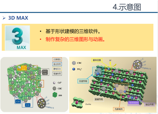 最后就是示意图,示意图其涵盖的范围特别广,可以是相关机理的分析探讨,或者是反应路径的设想推理,也可以是研究前景的目的展示,以及套路和猜想的形象化描述,这些同样也可以用PPT将文字和多种图形进行组合、拼接出来,但要涉及到这种更具质感、逼真、并有着高清晰度的立体图形的话,就需要用到更为高端的渲染软件3dmax,来用于形状建模和复杂的三维图形制作。这也是如今各大科研期刊用于绘制机理图和图形摘要的主流软件。另外,对于照片如电镜图这种类型的,后期可能需要用到PS软件或者AI软件进行一个对比度和亮度的调节。