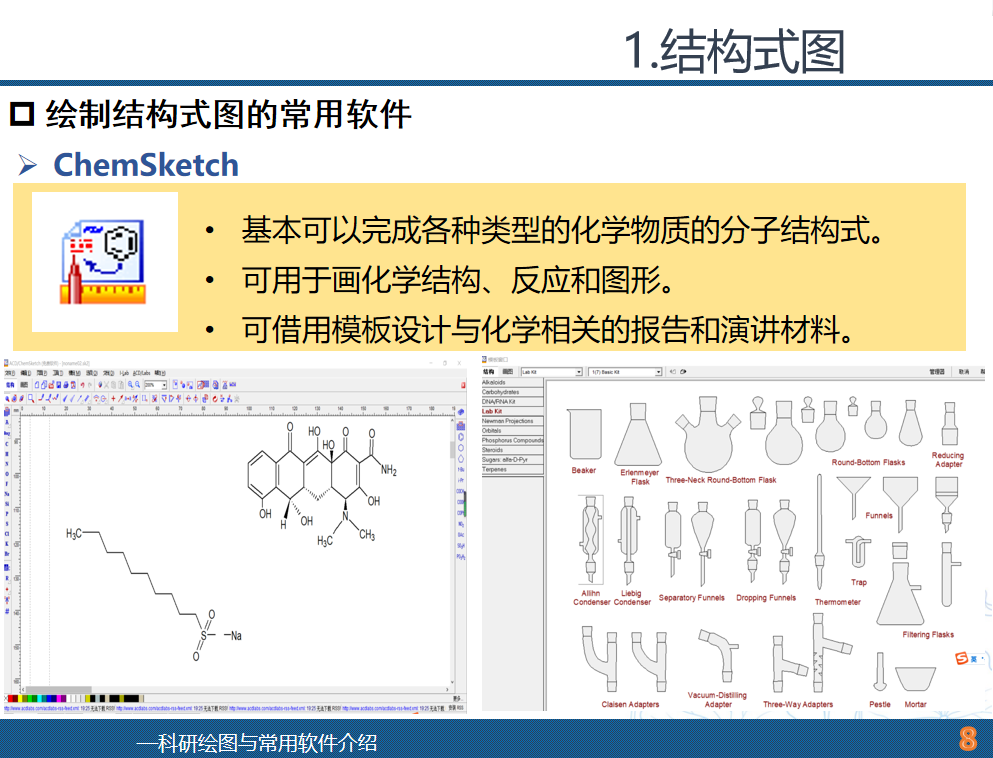 接下来,我们就直入正题。首先让我们看一下最常用的四种科研作图类型。首先第一种就是结构式图,对于我们理工科的学生而言,在毕业设计或者毕业实验中,不可避免的需要用到各种化学试剂、表面活性剂或者各种药物类材料,特别是在降解污染物的研究中,知道其化学结构式对于后续降解机理和反应路径的研究都极为重要,而结构式图也无外乎二维平面式和三维球棍模式这两种,其中二维结构一般可以采用chemsketch软件,任何复杂的有机长碳链烷烃类结构图、苯环类甚至含其他复杂官能团的分子结构都可以有它完成,也可以使用该软件自带的化学仪器模板来设计相关的报告和演讲材料。许多化学相关的教材撰写也可以用它来进行绘图。