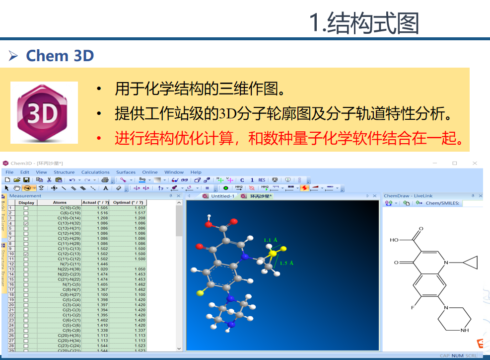对于分子结构的三维模式,可以使用软件chemical 3D来进行绘制,它可以将画出的化学结构式转化为三维立体结构,便于我们理解分子的空间形象,也可以用来分析分子的轮廓图和轨道特效,进行键长、键夹角等结构的优化计算等,向量子化学这块领域迈进。