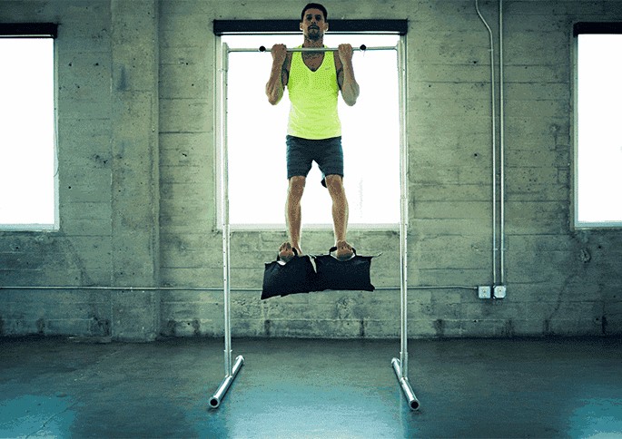 训练指导:双手握住横杠,掌心朝向自己,双手的握距依然大于肩膀的距离。呼气,尽量较多使用手臂的力量将身体上提。因此此动作主要刺激的部位为肱二头肌。吸气,再慢慢利用手臂力量放下身体。(图中的锻炼者脚部捆绑的沙袋是为了增加强度,新手可忽略。)