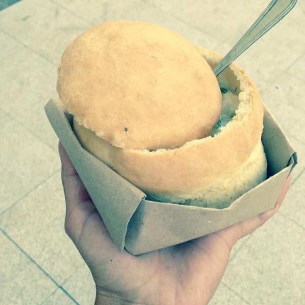 将鸡肉汤装在面包里,据说最好吃的就是沾满汤汁的面包部分