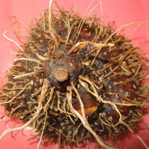 为缠绕草质藤本,块茎卵圆形或梨形,直径4-10公分,通常单生,外皮棕黑色,表面密生须根;
