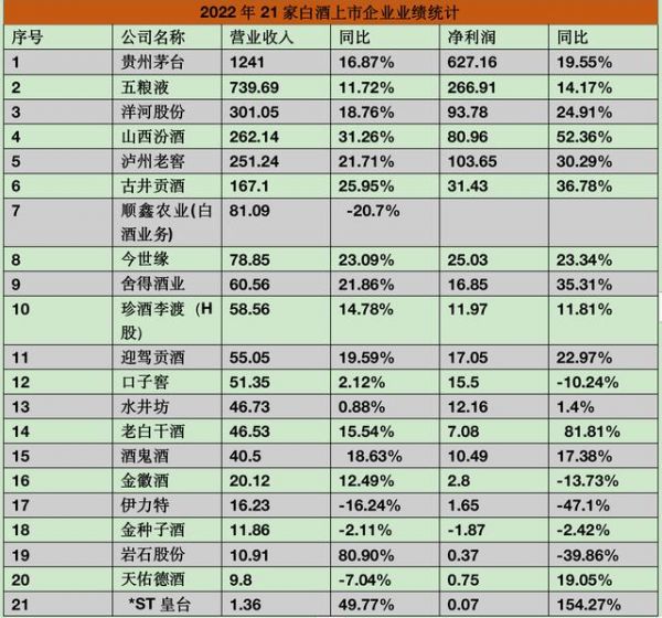 最大的变化出现在山西汾酒与泸州老窖之间,两者2022年与2021年的排名出现调换,山西汾酒的营收增速31.26%。两者的竞争依然胶着,营收差距仅约10亿元。