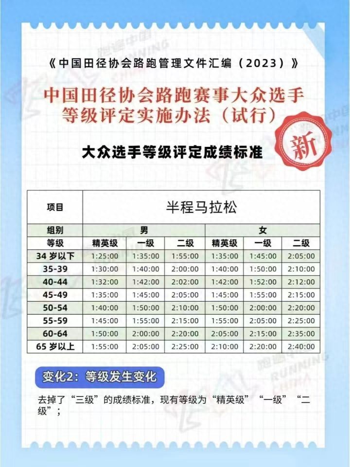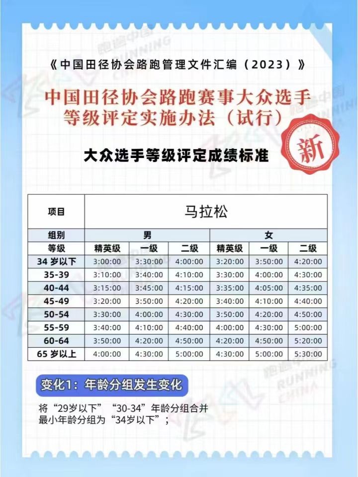 这里说一般人。所谓一般人是什么概念,普通人?平常人?大众?《中国田径协会路跑管理文件汇编(2023)》发布了一个《中国田径协会路跑赛事大众选手等级评定实施办法(试行)》,里面有《大众选手等级评定成绩标准》。
